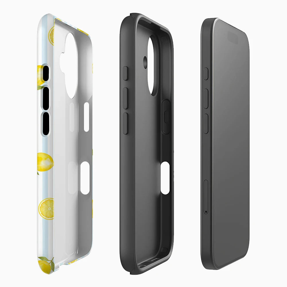 Die SWEET LEMON Case bringt sonnige Vibes direkt auf dein Handy. Kleine, zarte Zitronen treffen auf hellblaue Streifen und zaubern dir jedes Mal ein Lächeln ins Gesicht.